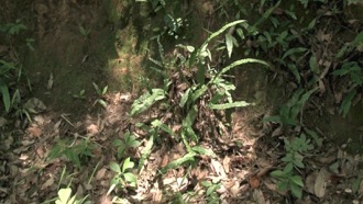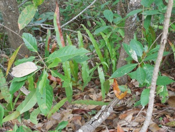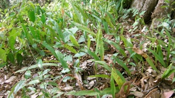 現地では上の3点や、2012年3月の撮影記録と同じシダが木に着生して這い上がっているものと解釈していたが、この写真をよく見ると、葉の表面の波打ち方などは下段の参考資料に上げた日本のクリハランの特徴も持っているので、もしかすると上に取り上げたシダとは異なる種であるのかも知れない。