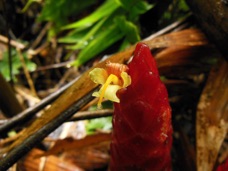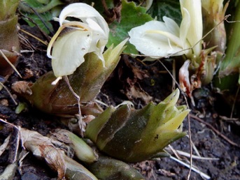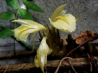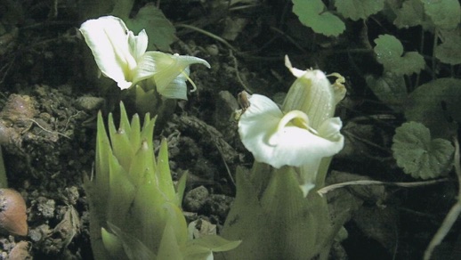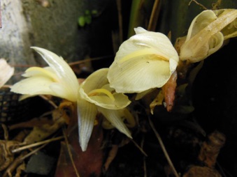2011.09.30 自宅。 ミョウガの花は日が落ちてから咲くのでライトを当てて撮影した。色々なライトを当てて出来るだけ自然な色に近づけられるようトライしたが巧く行かない。ここにUPしたものは直径25cmほどの口径にLED32球を埋め込んだスポットライトを1回レフに当てて拡散させた光で撮影したもの。なんとか手ぶれは抑えられたが、自然な色は得られていないが、なにやら艶かしい雰囲気が伝わってくる。