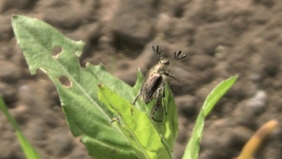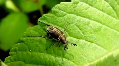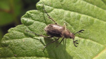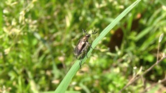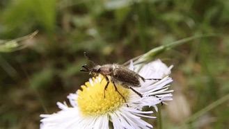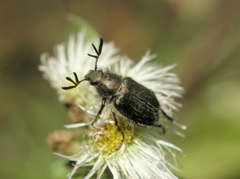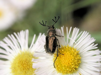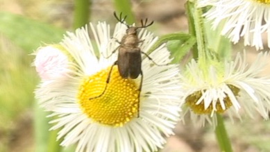 ガイコツ山にハルジョオンの白い花が咲き始めると、ガイコツ山の昆虫達も動き始める。このヒゲブトハナムグリもハルジョオンの開花と同時に出てくる昆虫の一つ。大人の膝の高さ=ハルジョオンの花の高さほどを忙しく飛び回りひとしきり飛び回った後は翅を休めるかのように小休止を取るのでその時が撮影のチャンス。小さな身体に似合わない牡のトナカイのような立派なヒゲが格好いい。