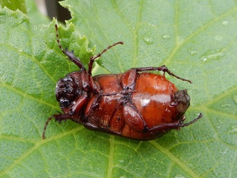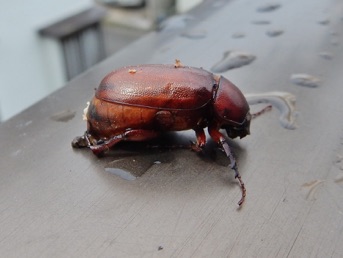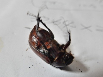 2018.05.26 水が溜まった水受け皿の掃除をしようとして、植木鉢を持ち上げたら鉢底から出てきた。その時点ですでに死んでいたので、この植木鉢の中で成虫になったのか、成虫が飛んできて産卵して息絶えたのか不明。ガイコツ山ではこの大きさの茶色いコガネムシはあまり見ていない。