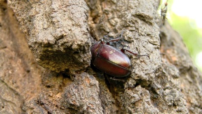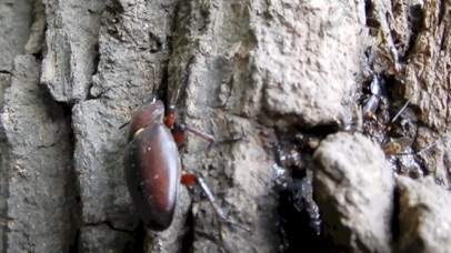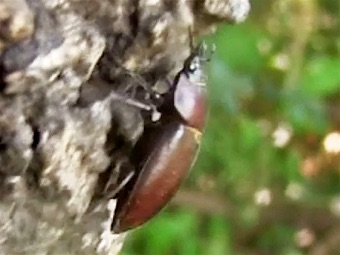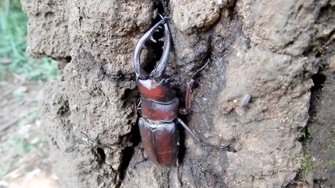 左の動画はカブトムシのところで紹介した「ぐんま昆虫の森」で撮影したもの、同じ樹液酒場での一コマ。薄茶色の大きな背中はカブトムシのメス。