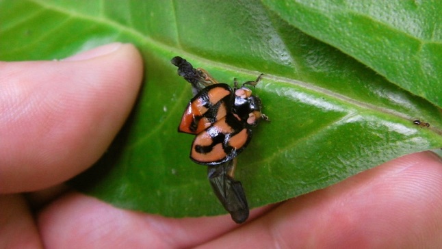 2011.07.09記:前週傷ついたカメノコテントウを見つけた場所に出かけ、念願の「活きのいいカメノコテントウ」の発見と撮影を果たした。