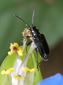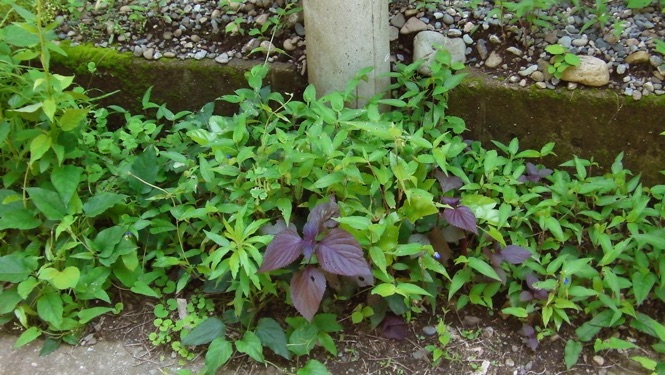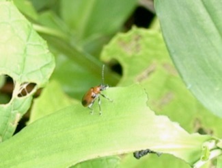 2011.06.22 自宅 カワリクビボソハムシを見つけたツユクサの生えた一隅。わずかこれだけの範囲に下段の意匠違いのハムシを見つけたことで疑問が生じた。もっと広い草むらだったら疑問は生じなかったろうし、カワリクビボソハムシという種があることに行き着くこともなかったと考えると、ある意味でラッキーなことだった。