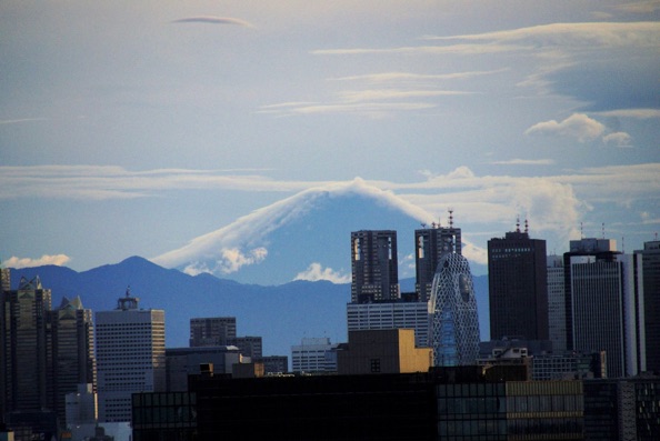 *富士山の周りにべったり雲がへばりついているように見えます。