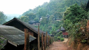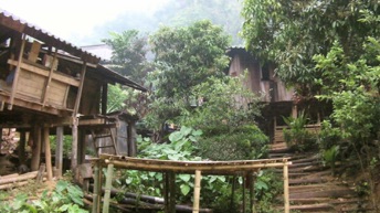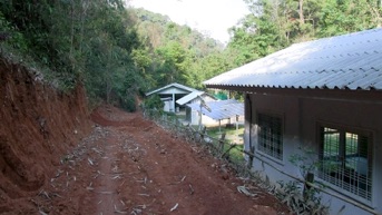 コミュニティーハウスから北の方向を見上げると村の住居群が目に入る。2012年10月まではその視界を邪魔するかのように今にも倒壊しそうでしない物置小屋?が居座っていたが、2013年2月、とうとうコンクリートの柱だけ残して上部は消えていた。